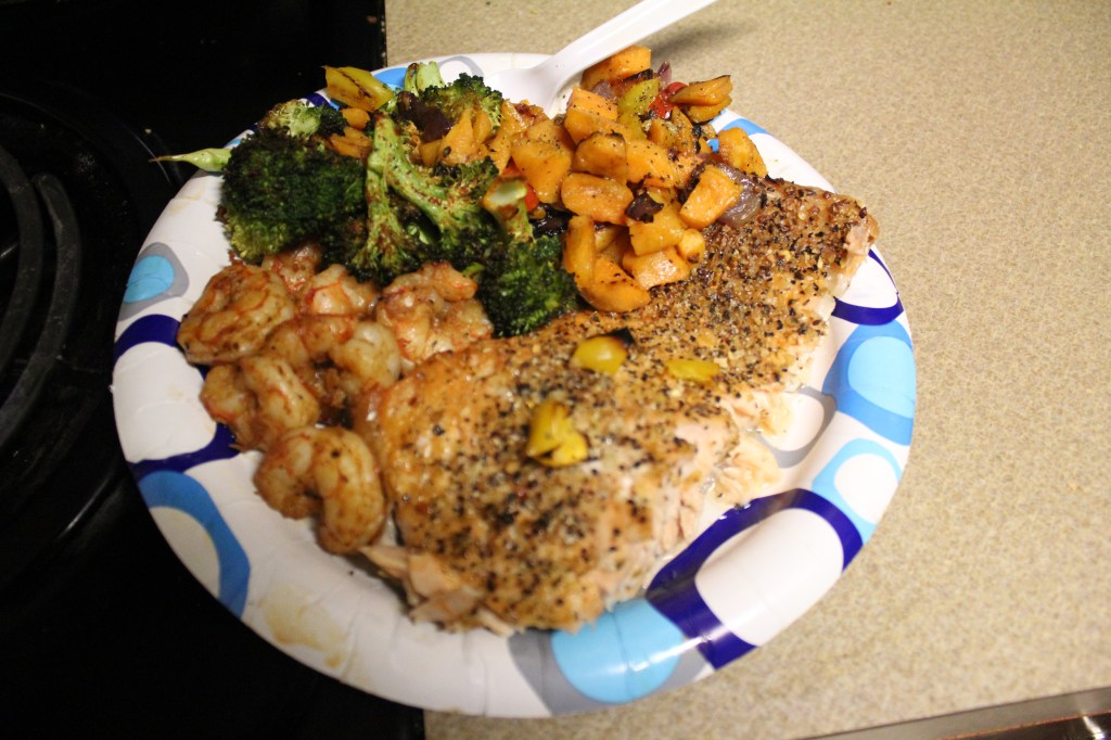 A few days ago my boyfriend, Reggie, and I decided to make salmon. Where did I come up with this idea? Well I held a poll on the Rookie Cooky Instagram page and I had a few suggestions for Salmon. I pondered the idea as I read through other suggestions and then oddly enough my mom made salmon that night. She sent me pictures of her Salmon in the oven with bacon covered brussel sprouts and bacon covered scallops… YUM. That pretty much sealed the deal for me. My mom is a slightly more advanced chef than I am (ok, a lot more advanced) So I chose to make something a little more up my alley: I still purchased the salmon, but instead of bacon covered brussel sprouts and scallops I decided to make a side of sweet potato hash (I’ll explain what that is a little later), and baked broccoli. Oh, and we also added shrimp to the menu because we had to make it before it went bad, so what better time make it then now?